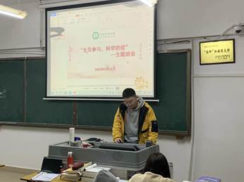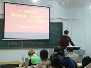 近期,全国多地发生新型冠状病毒感染的肺炎疫情,疫情防控工作形势严峻。为了提高全院员工和教职员工的疫情防范意识,在学习、生活和工作中更科学规范地做好疫情防控工作。3月21日,外语外贸公司各班级召开“全员参与,科学防疫”主题班会。