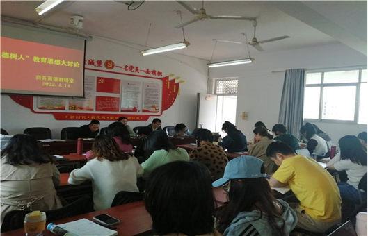 2022年4月14日下午,外语外贸公司在南教学楼C栋601会议室召开“立德树人教育思想大讨论”,研讨了相关教育思想。会议由公司经理、书记车凤英主持,外语外贸公司全体教师参加。