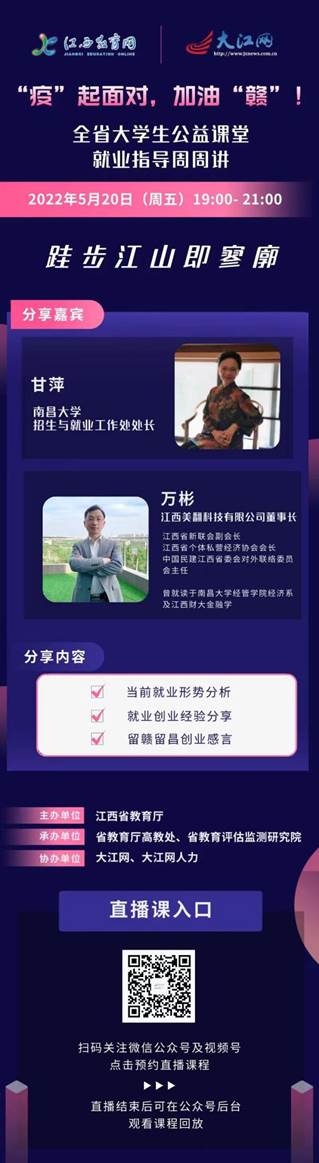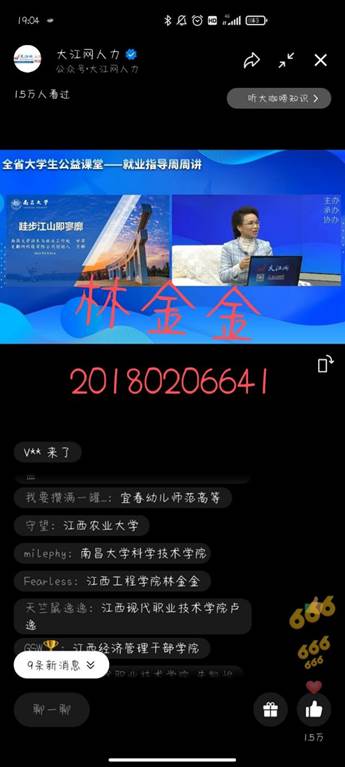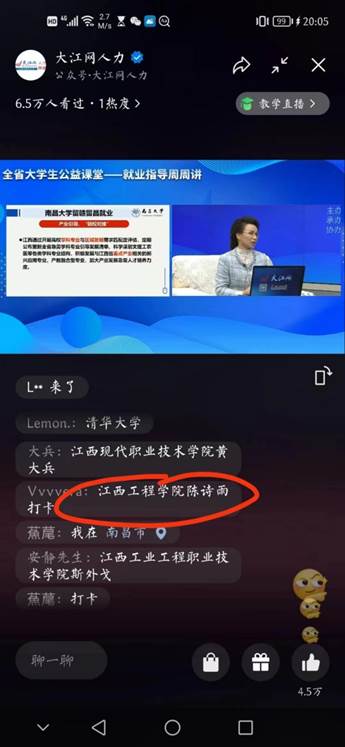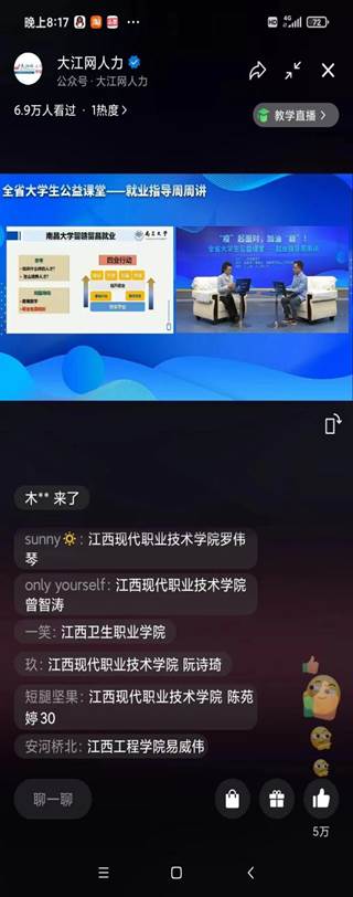 为满足疫情防控常态化形势之下老员工求职的需求,帮助毕业生树立正确的就业观。2022年5月20日晚,由江西省教育厅主办,面向全省老员工的线上公益课堂——就业指导周周讲准时开课。外语外贸公司积极响应江西省教育厅号召,组织公司全体同学观看线上公益课堂。