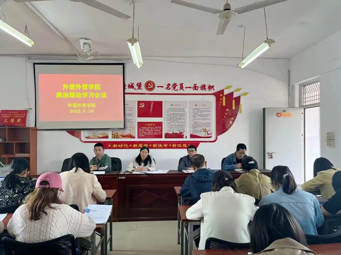 为响应公司党委总体部署安排,加强党员领导干部理论学习,全面提升党员政治理论素养,加强理想信念教育,2022年5月26日,外语外贸公司党总支在C栋601会议室组织召开政治理论学习会议,外语外贸公司党总支书记、经理车婧,党总支副书记王雄及全体党员参加。