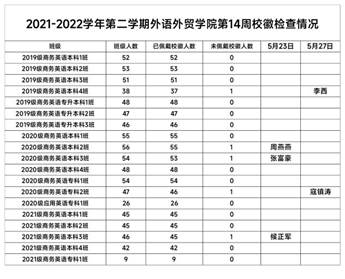 以上是本周纪检考勤情况,其中班级出勤率较差的有:2020级应用英语专科1班和2019级商务英语本科4班。个人出勤率较差的有:2020级商务英语专科2班的董奕,寇镇涛。本周优秀班级有:2021级商务英语本科1班、2021级商务英语专科1班、2020级商务英语本科4班。