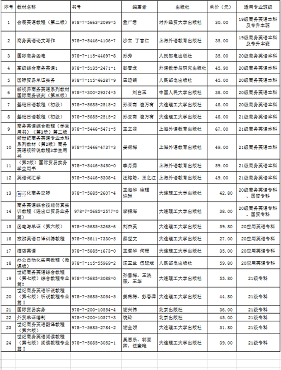 学期教材经过公司教材选用工作专家组和任课教师的推荐和审核,现将外语外贸公司各年级使用的教材公示如下: