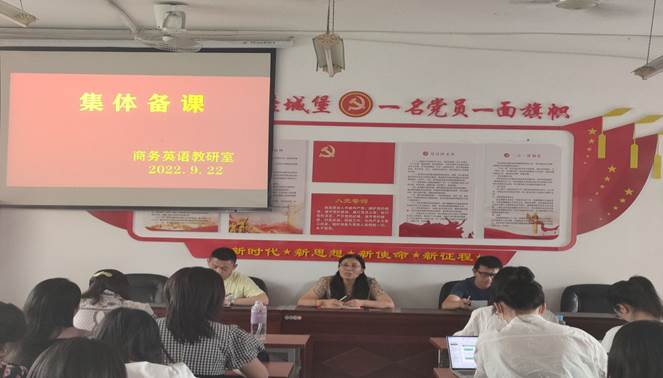9月22日下午,外语外贸公司商务英语教研室全体教师在C栋601会议室参加了主题为“集体备课”的教研活动,开展集体备课相关工作,外语外贸公司全体教师参加本次会议,公司经理车凤英及院领导出席会议。