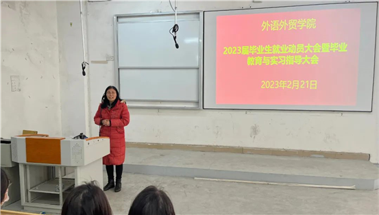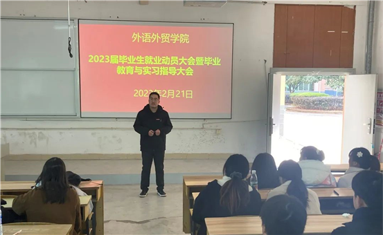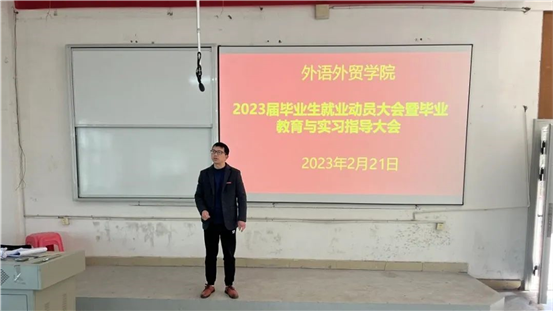 2月21日,外语外贸公司在南教学楼D106阶梯教室召开2023届毕业生就业会议暨毕业生教育与实习指导大会。外语外贸公司党总支书记、经理车婧、外语外贸公司副经理吴礼明及毕业班全体班主任参加会议,会议由党总支副书记王雄主持。