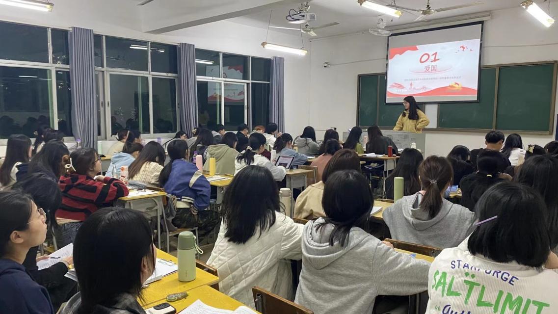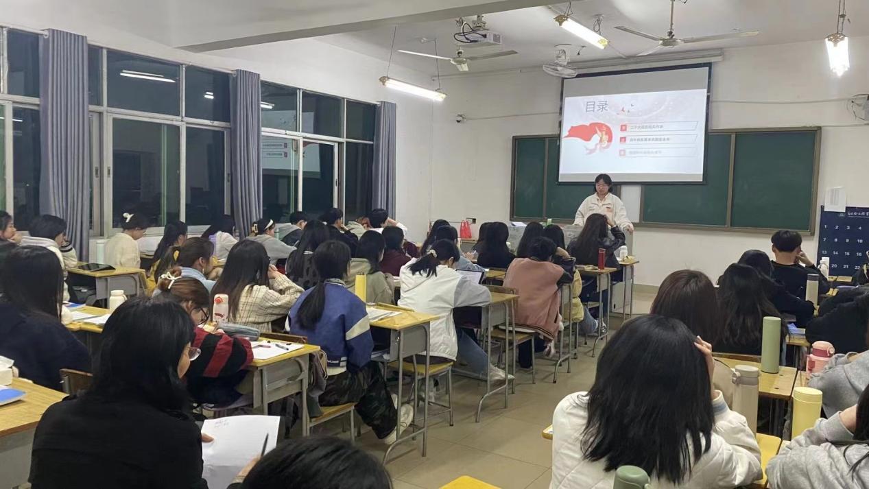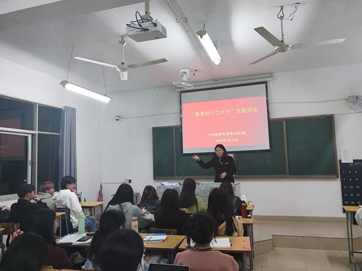 为深入学习党的二十大精神,贯彻落实习近平新时代中国特色社会主义思想,3月13日晚,外语外贸公司在D305开展了“青春践行二十大”主题班会。本次班会由班主任易威伟老师主持,并邀请外语外贸公司党总支书记、经理车婧参加,2020级商务英语本科1班全体同学参加本次班会。