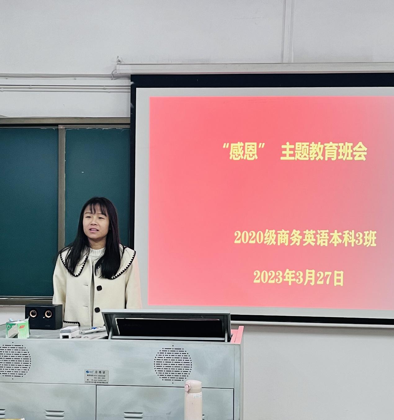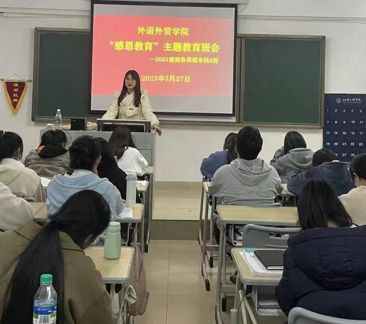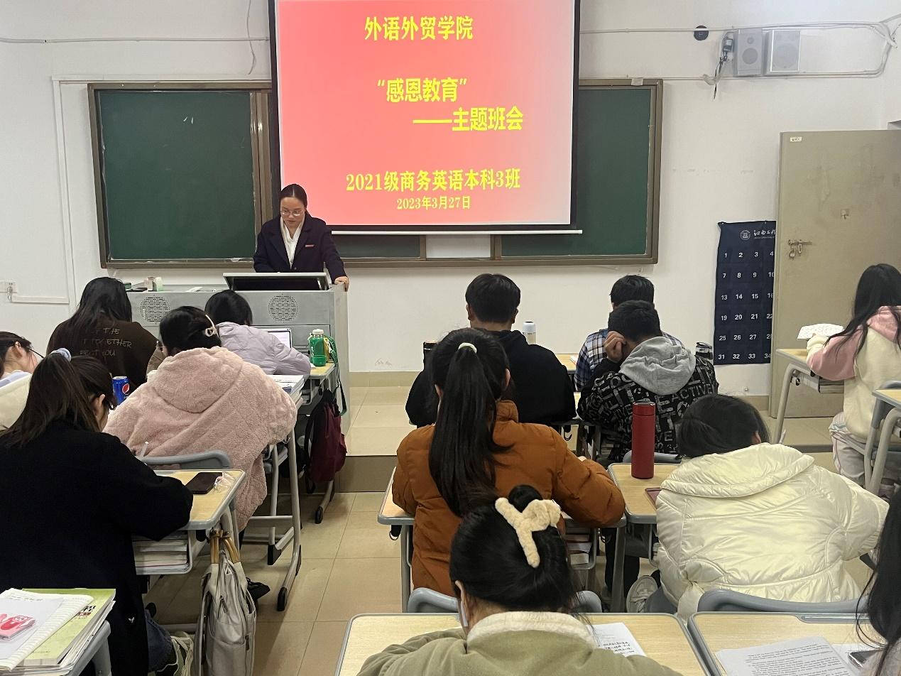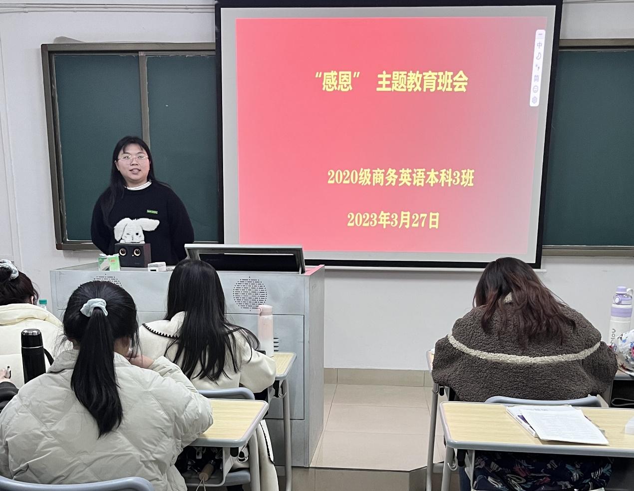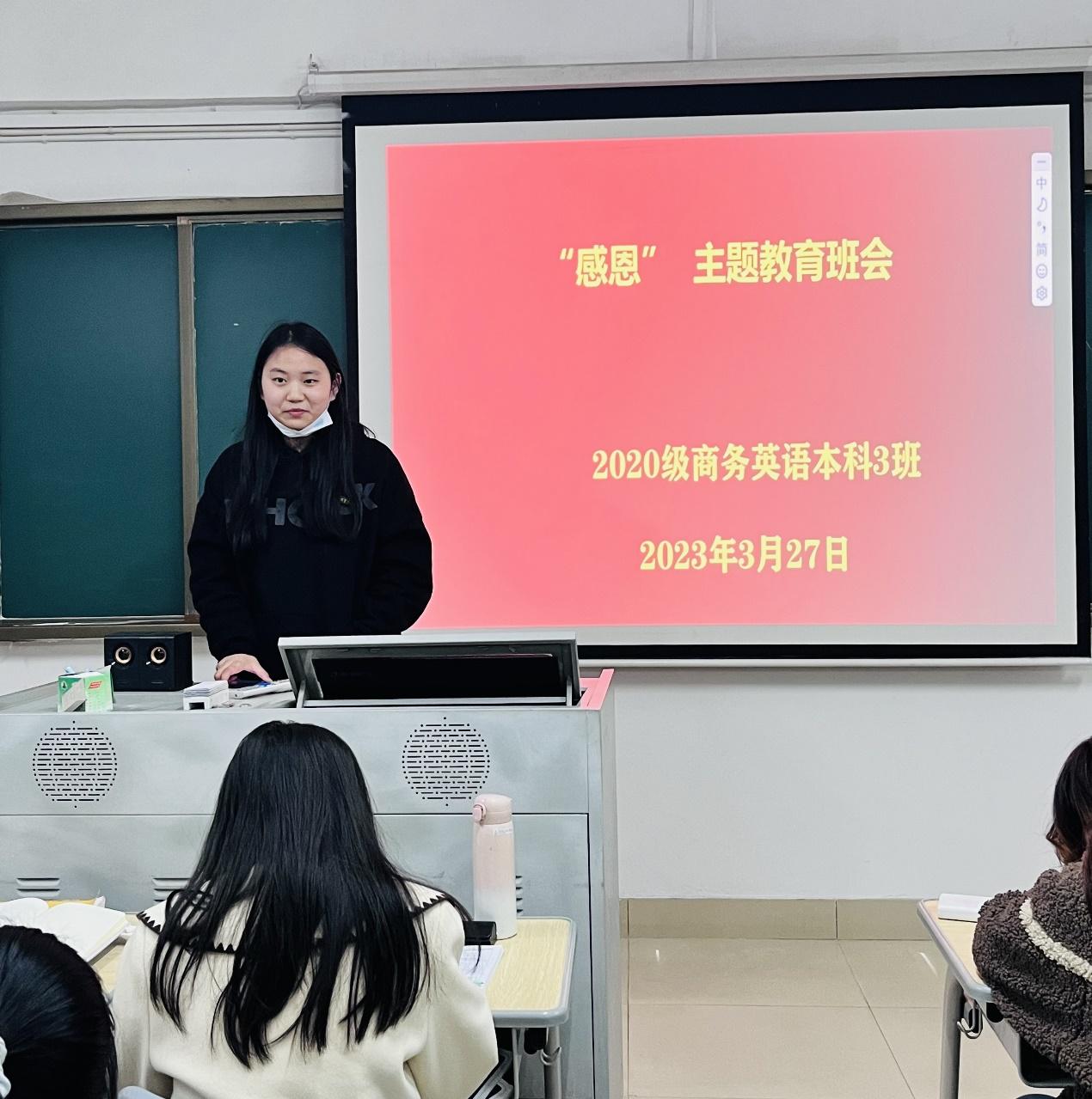 为引领班风,培养青年品格,3月27日晚,外语外贸公司组织各班开展以“感恩教育”为主题的班会课,饮水思源,怀揣感恩之心,共同书写青年担当。