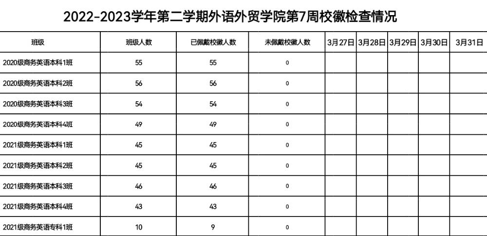 以上是公司第七周的校徽佩戴情况,本周所有班级表现得都非常好,希望大家继续保持下去。为之须恒,不恒则不成。凡事要有坚韧不拔的毅力和坚持不懈的定力,一着不落地坚持下去必成大器。