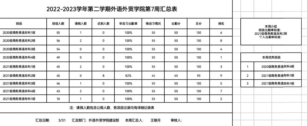 学风建设第1线 | 第7周卫生考勤情况通报汇总表