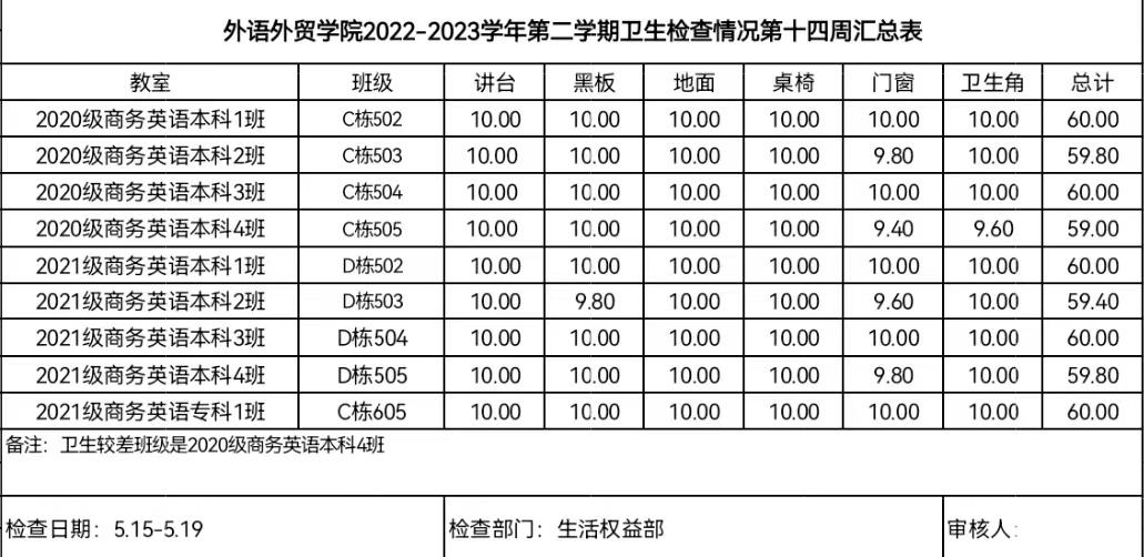 以上就是公司第十四周的卫生及早读出勤的情况。大部分班级表现很好,但还有部分班级需要加强卫生管理,卫生角和门窗的卫生需要引起重视,希望下次能有所改善。