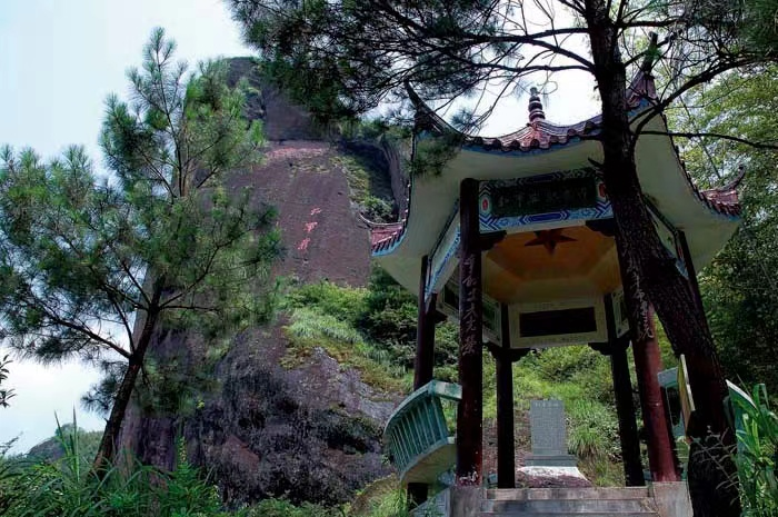 目之所及是红军岩。红军岩在高阳村境内,军潭水库东岸。山崖高耸,岩壁峻峭。民国二十一年(1932年)初,苏区红军开赴闽北作战,留赤警营一个排驻守高阳。二月初,“江、广、浦联防队”出动500多人,乘虚袭击县苏维埃政府。为掩护县委机关和群众转移,周排长率领战士与敌人鏖战,后因弹尽,剩下二十一名战士跳下悬崖,壮烈牺牲18人,为纪念革命烈士,崖壁上刻有“红军岩”三个大字。