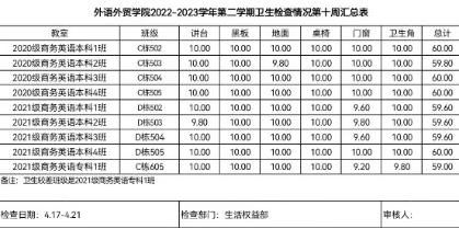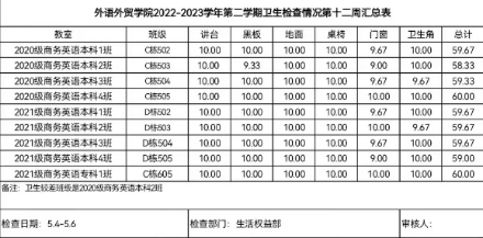 2.检查全校各班级卫生情况。配合院生活权益部,共同对公司卫生定期进行检查,并及通报改善卫生情况,使各班级保持教室整洁,营造一个良好的学习环境。