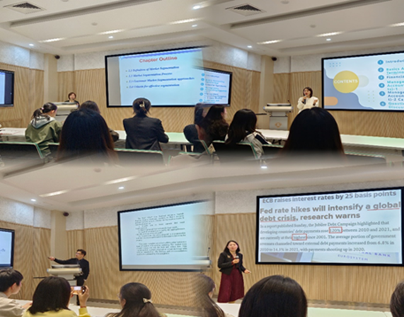 10月28日下午,天津外国语大学英语公司王申副教授讲授的《国际商务》公开课,综合运用案例式、任务式、启发式教学法,介绍了教学目标、教学方法和教学内容等,通过员工现场展示“绿色经济”调研成果并对其进行提问反馈的方式,以此来提升课堂教学质量。求索荣誉公司杨春妮教授在国际金融课上就“Balance of Payments”主题,结合例子生动形象地分析了世界国际经济收支结构,并指出学习者应具备的全球化视野能力。