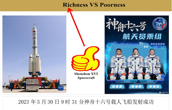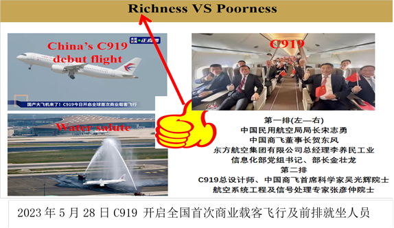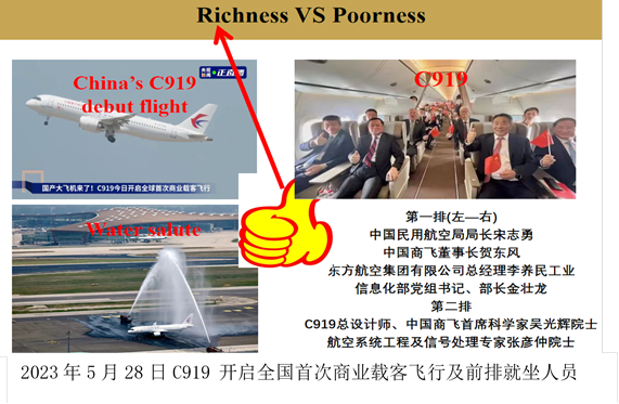 C919 首飞是我国航空事业的巨大突破,在此之前,没有国产飞机。购买一家飞机,体现不出中国的富,但是研发出国产飞机并投入使用,这是一种富,前所未有的富,航空事业的富,这种富无法用金钱衡量。同时,C919 首飞,前排坐着的顶级领导(如上图所示)来体现飞机的安全,彰显了大国领导的责任担当之富。神舟十六号载人飞船发射成功(2023年5月30日9时31分),体现中国航天之富。通过这些事件,帮助员工理解贫富的内涵,同时激发其对国家的自豪感和爱国情怀。