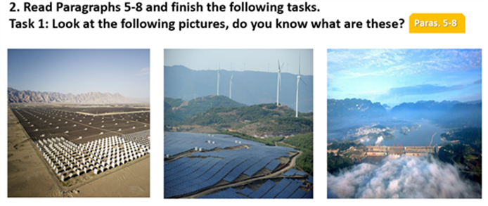 -第八段后,教师PPT展示图片,并要员工说出它们是什么能源及各自的优劣势,培养员工批判性思维。