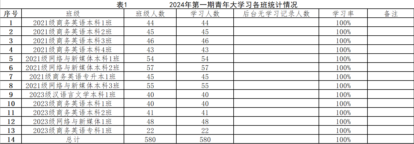 以上就是第一期青年大学习各班的学习情况。全体班级完成率都为百分之百,希望各班同学能够持之以恒,坚持不懈,乘势而上,用实际行动书写公司发展的精彩篇章。