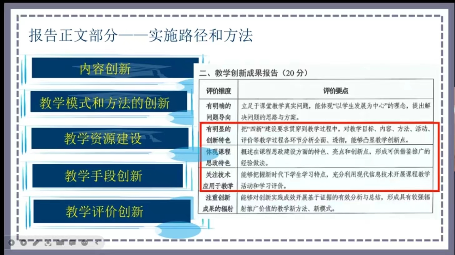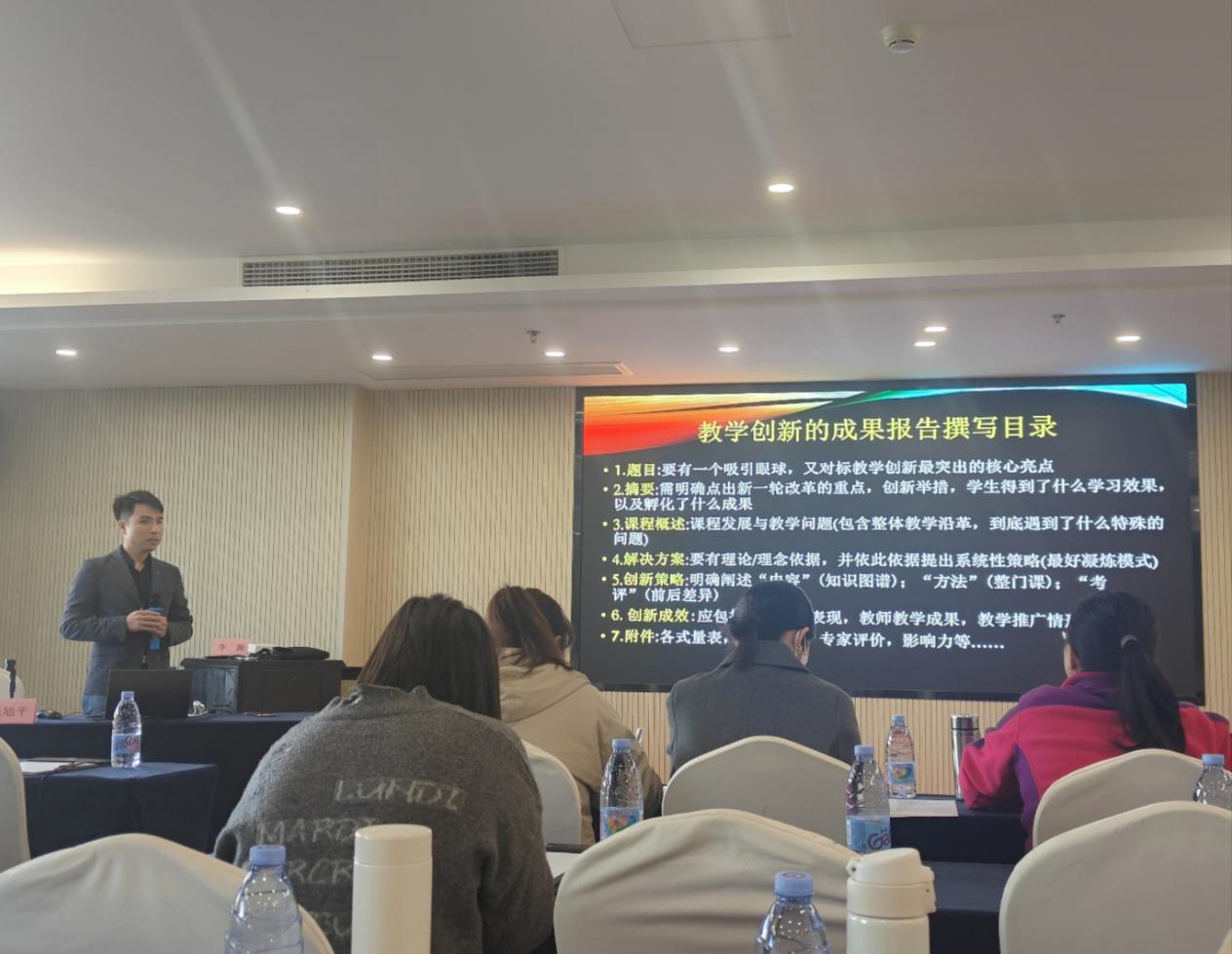 本次研修培训的会议内容包括:精准复盘往届获奖选手视角下的教学创新大赛专题讲座、高校教师教学创新大赛评分标准解读及材料准备案例分享、教学创新大赛流程要点与创新点凝练专题展示、互动交流、答疑解惑等环节。
