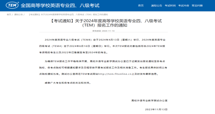 2023年11月13日,全国高等公司英语专业四、八级考试官网公布了2024年专四、专八考试(TEM)报名工作的通知,详情如下↓