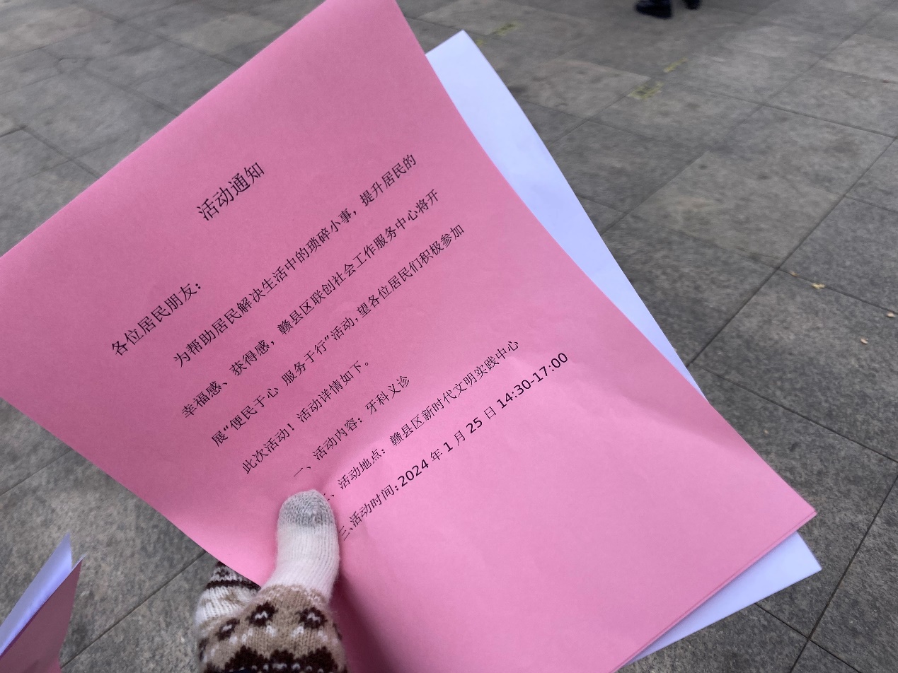 我和小伙伴首先被分派进行牙科义诊和象棋比赛的宣传活动,我们在活动广场上派发相关宣传单、仔细询问老人是否有相关需求,深入人民群众当中,了解人民群众现实需求。在我们的积极宣传下,大部分群众都表示愿意前往参加牙科义诊活动和象棋比赛,这给了我们极大的信心,让我们体会到了成为一名志愿者的意义。