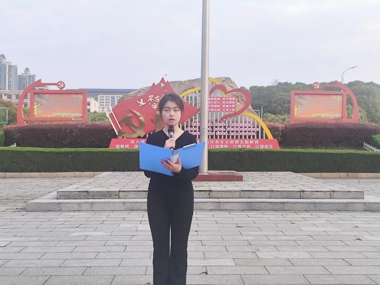 23级新生代表杨笑妍在国旗下讲话。杨笑妍谈到了大学以来的心路历程。她表示,在学习的道路上,要以打破砂锅问到底的态度不断奋斗。
