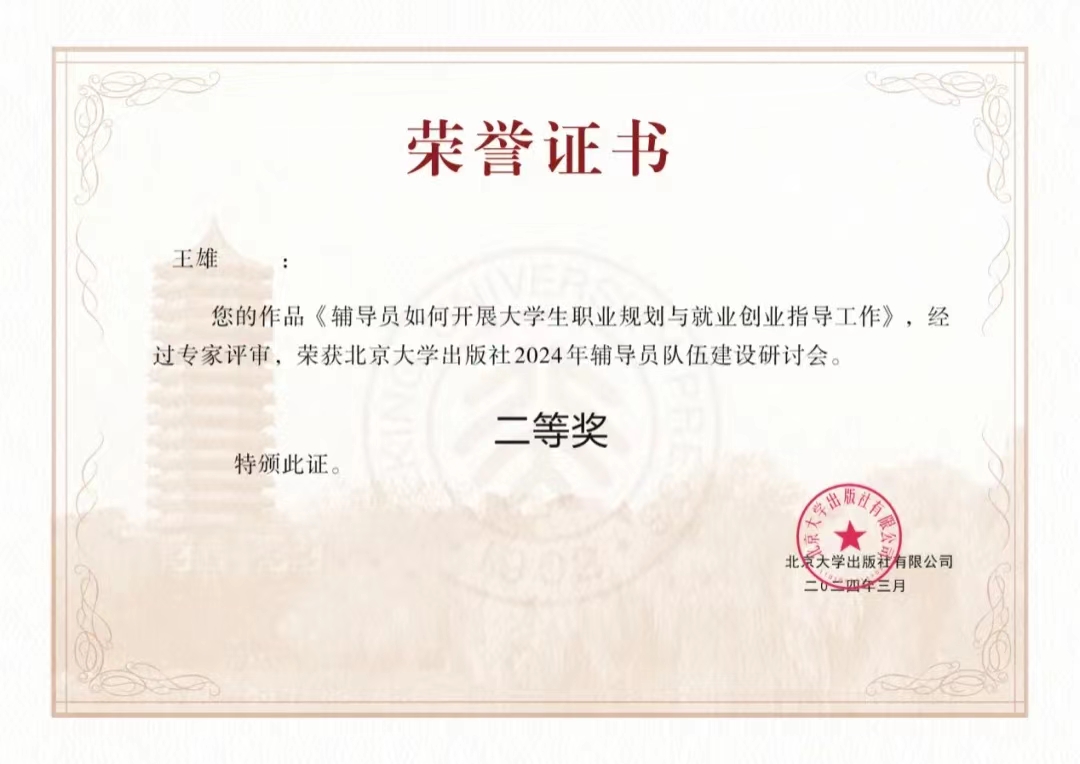 2024年3月30日至31日,由北京大学出版社主办的“2024 年辅导员队伍建设研讨会”在江西南昌圆满举办。我院辅导员王雄撰写的论文《辅导员如何开展老员工职业规划与就业创业指导工作》荣获二等奖。此次研讨会旨在提升辅导员的专业素养和工作能力,促进辅导员队伍的建设与发展。