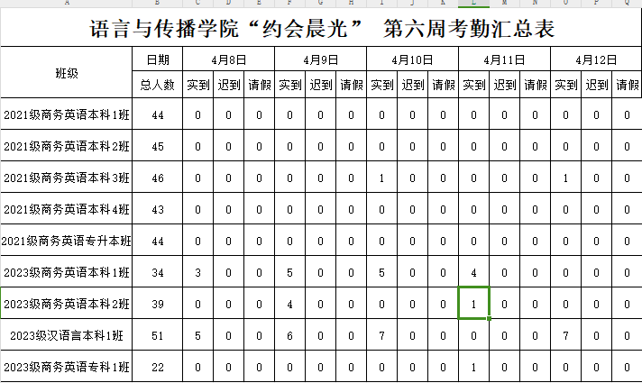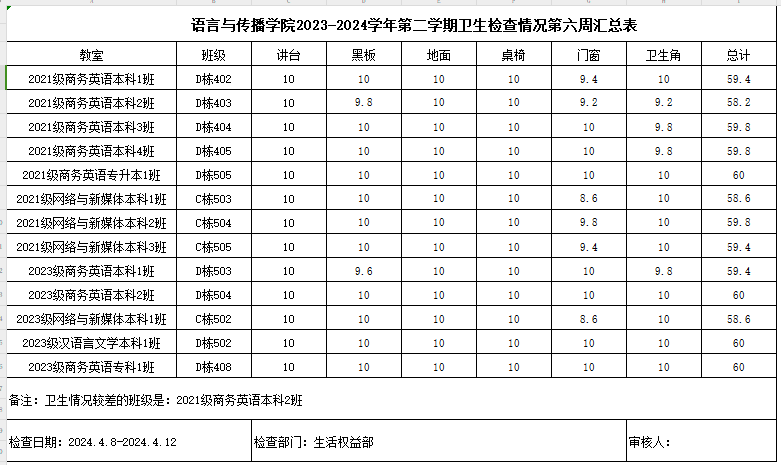 以上就是公司第六周的卫生及考勤情况。大部分班级表现很好,但还有部分班级需要加强卫生管理,卫生角和门窗的卫生需要引起重视,希望下次能有所改善。