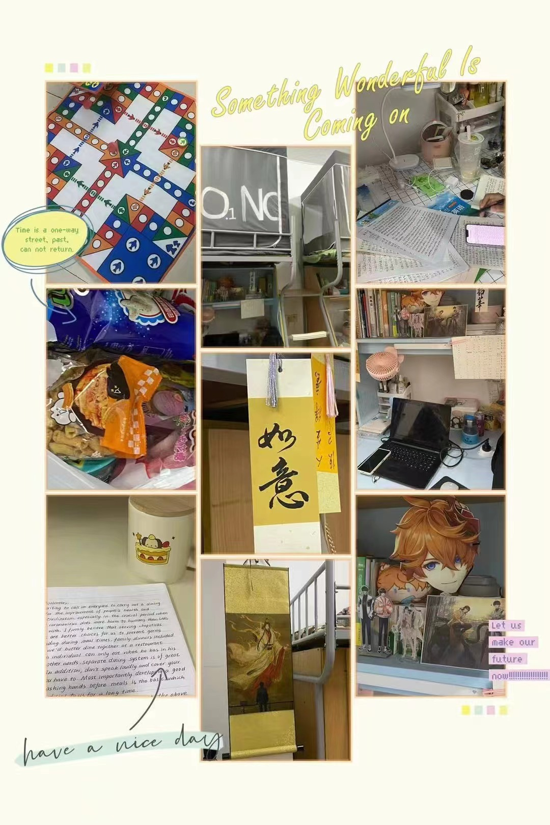 3.寝室氛围温馨怡人。舍友们共同制作寝室特色门牌;文化字画、书法书签点缀营造寝室文化氛围;爱好广泛,绘画舞蹈电视剧;舍友乐于分享、互帮互助。