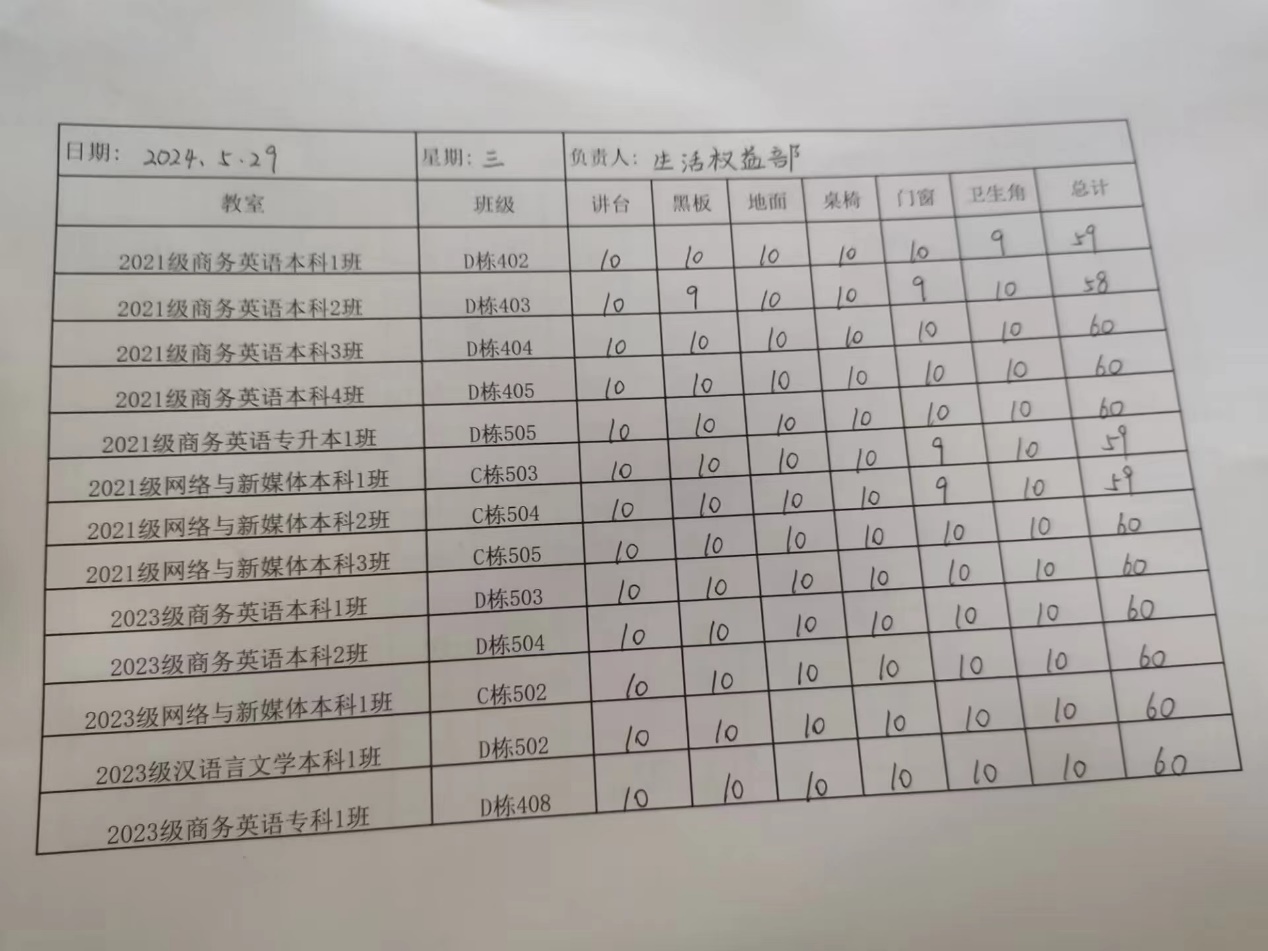 学习的地方是我们生活的家园,美化家园是我们义不容辞的责任。为了进一步美化校园环境,营造一个温馨舒适的学习生活环境,信誉最好的十大体育平台于5月29号下午,开展了以班级为单位的卫生大扫除活动。随后,权益部成员对各班教室进行了全面检查,以下就是各班的卫生情况。