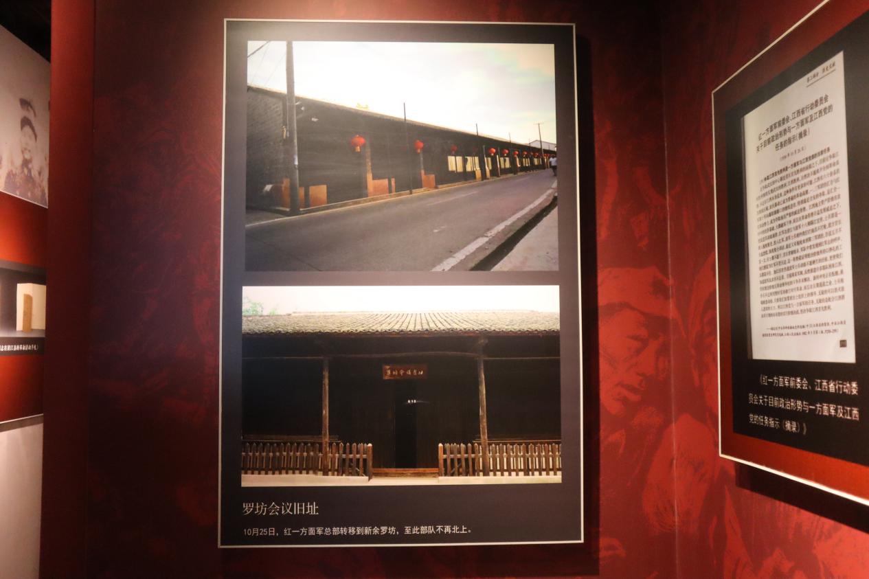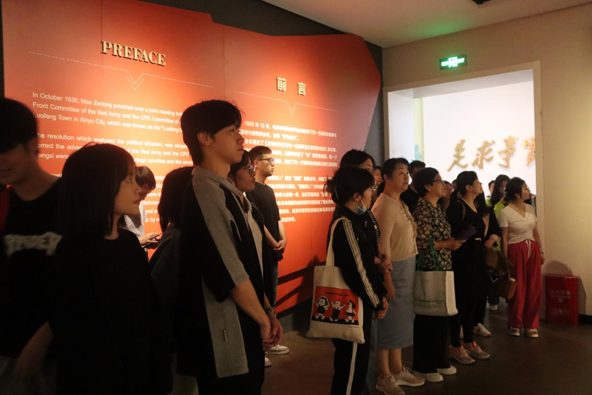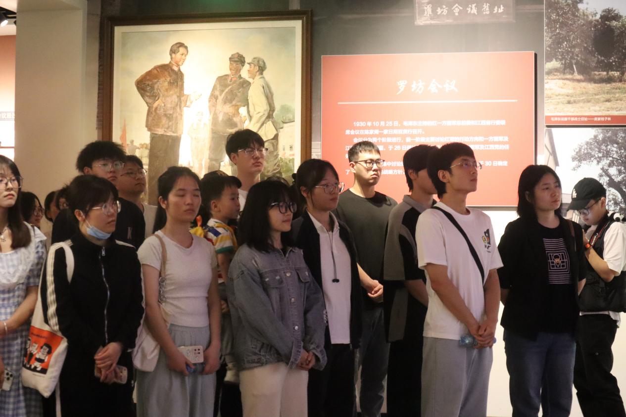 参观中,同学们跟随着讲解员的脚步,进入陈列展厅参观学习。馆内设有罗坊会议、兴国调查和新余革命斗争史三个主题展览,以图片、实物、文献和档案等形式,全景式生动呈现了毛泽东、朱德、彭德怀等老一辈无产阶级革命家在罗坊的革命实践的丰功伟绩。