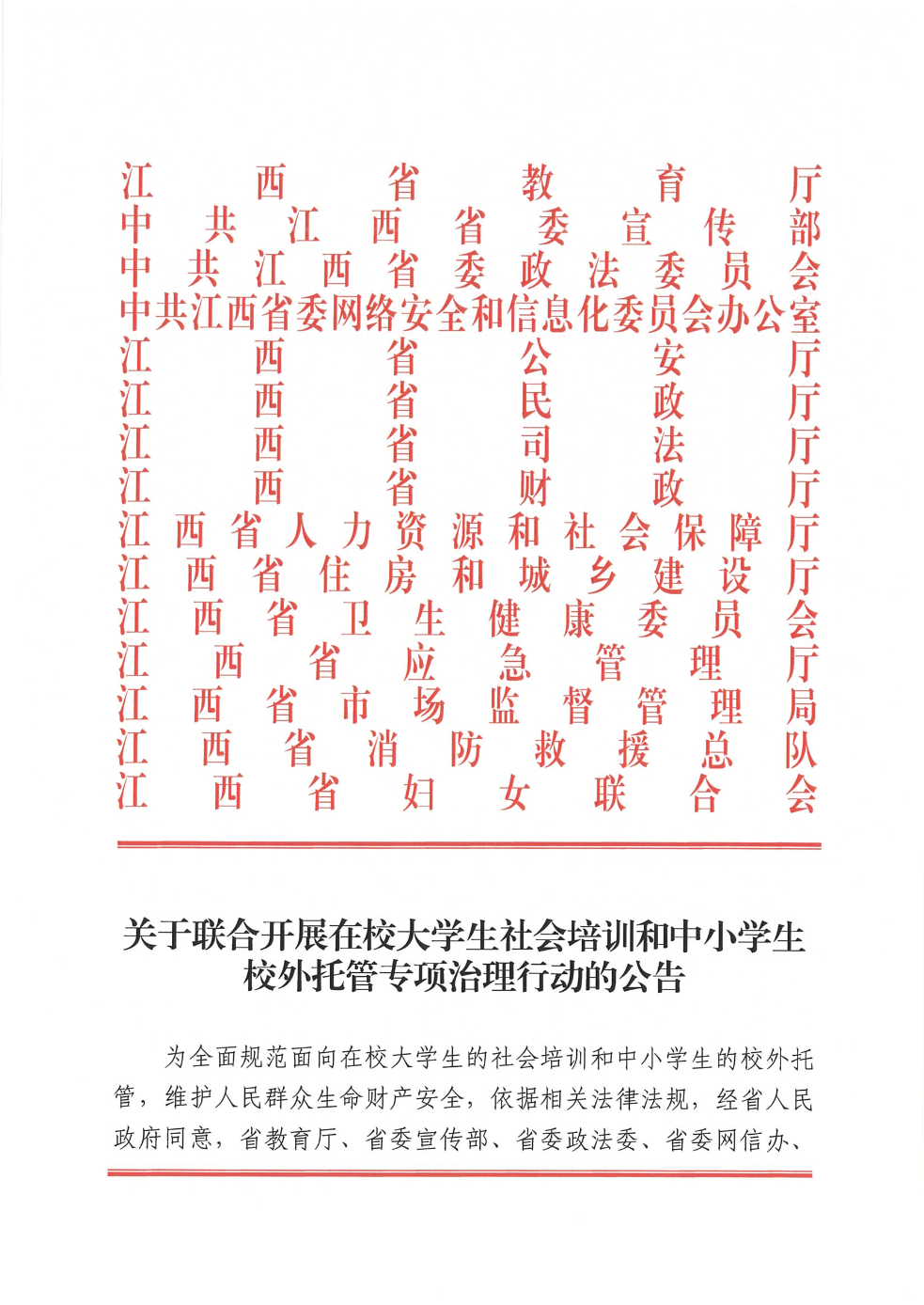 关于联合开展在校老员工社会培训和中小员工校外托管专项治理行动的公告