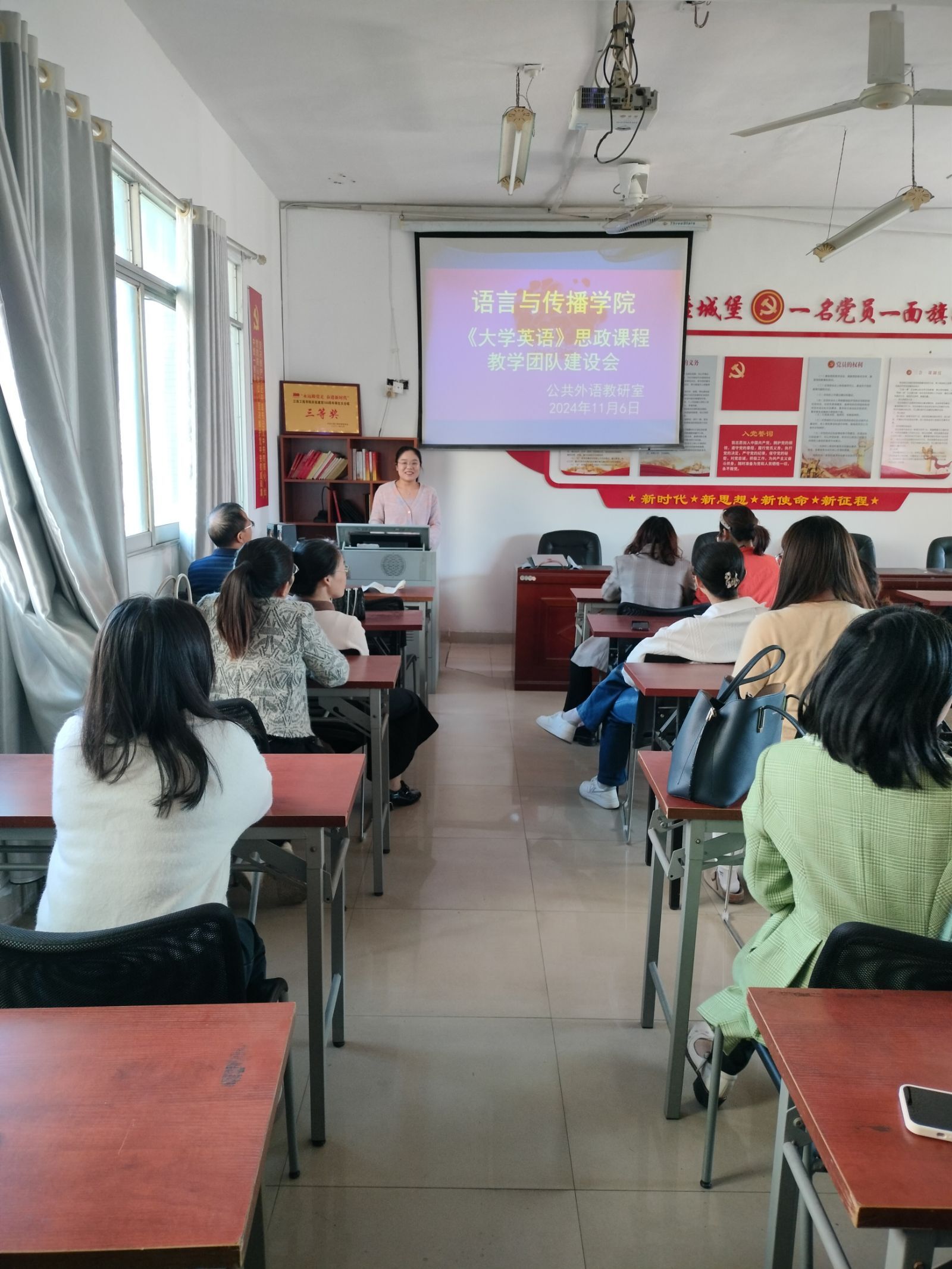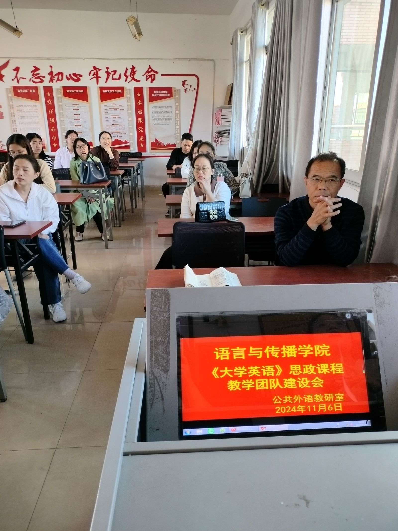 2024年11月6日下午,公共外语教研室召开《大学英语》思政课程教学团队建设会,全体公共外语教师参会,会议由教研室主任胡金主持。