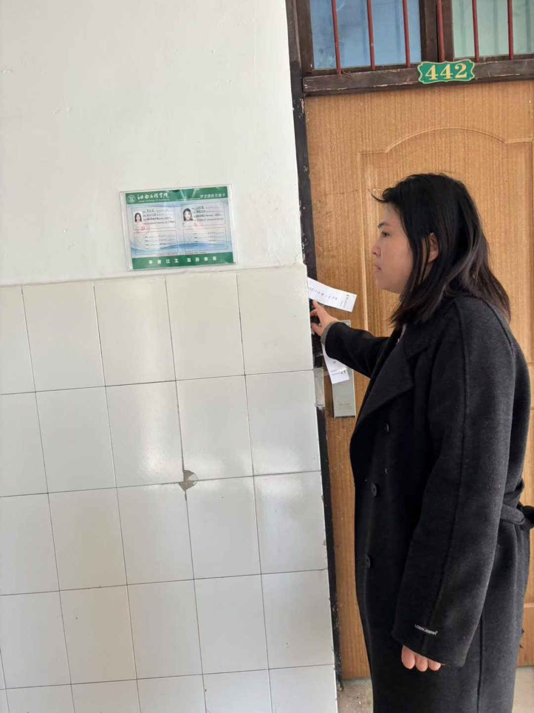 走访中,书记一行人深入宿舍内部,秉持严谨认真的态度,对宿舍的安全和卫生进行了反复检查。她们检查了宿舍的电源关闭情况、宿舍内的设备是否老化或者损坏,以确保电源切断,不会引发火灾、爆炸等安全事故。她们还检查了宿舍楼周围环境的要害部位,清除了周围的杂物,确保通行的方便和安全。同时,检查了水龙头、水闸、水管等设施,避免不必要的水资源浪费和浸蚀损坏。最后,在确保干净的情况下在宿舍门上张贴封条。