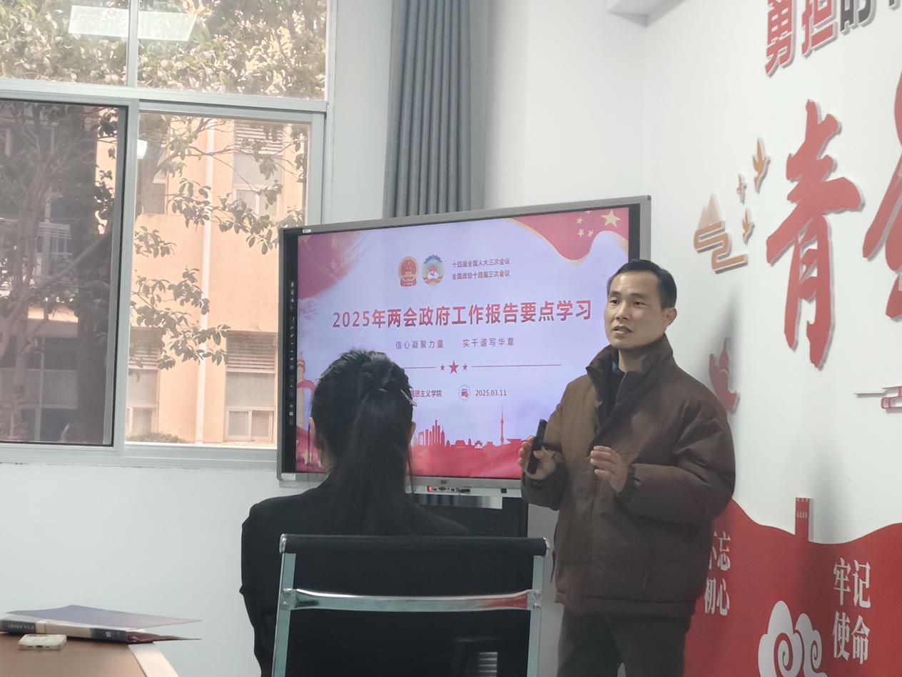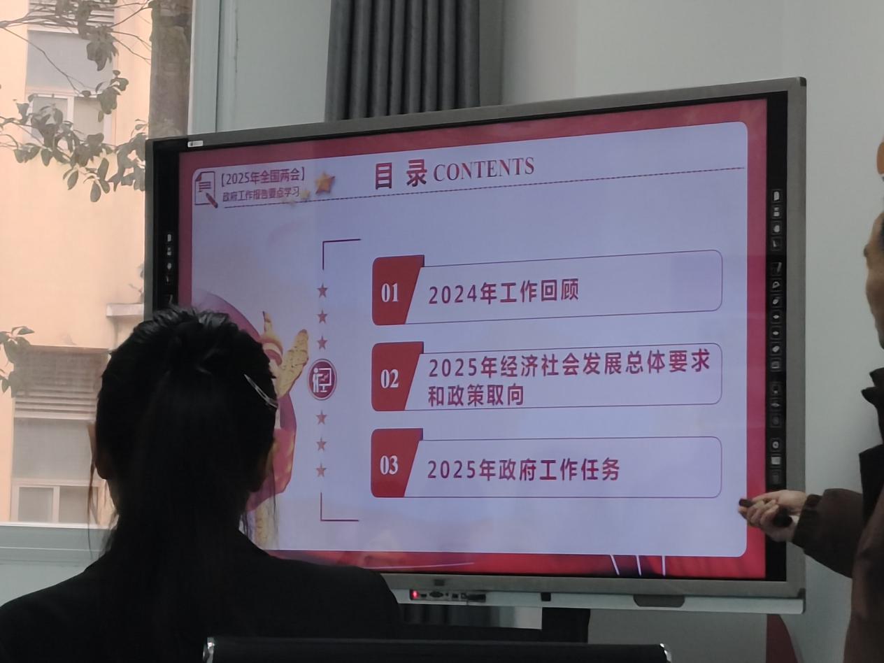 在宣讲过程中,俞少华老师就2025年两会政府工作报告要点展开宣讲。2025年全国两会再次为我们描绘了国家发展的宏伟蓝图,尤其是教育与经济领域的诸多要点,更是引发了党员和团员们的热烈讨论与深入学习。