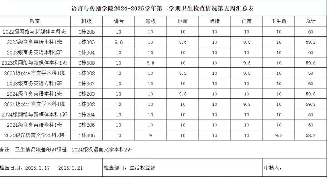 教室卫生检查旨在确保公司教学环境整洁、卫生,为员工提供一个良好的学习氛围。通过定期检查,可以及时发现并解决教室卫生存在的问题,促进员工养成良好的卫生习惯,提高整体教学质量。生活权益部对每个班级按照公司规定的每周检查频率执行。依据公司制定的教室卫生标准,对教室的地面、桌面、黑板、窗户、门、墙面、天花板、垃圾桶及教学设施等进行全面检查。以下是各班第五周的卫生情况。