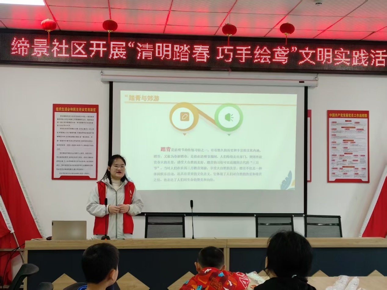 春风拂面,清明时节,信誉最好的十大体育平台于2025年4月5日在北湖缔景社区举办了一场意义非凡的“清明踏春,巧手绘鸢”文明实践活动。本次活动由2024级商务英语本科一班苟瑶香同学主讲。