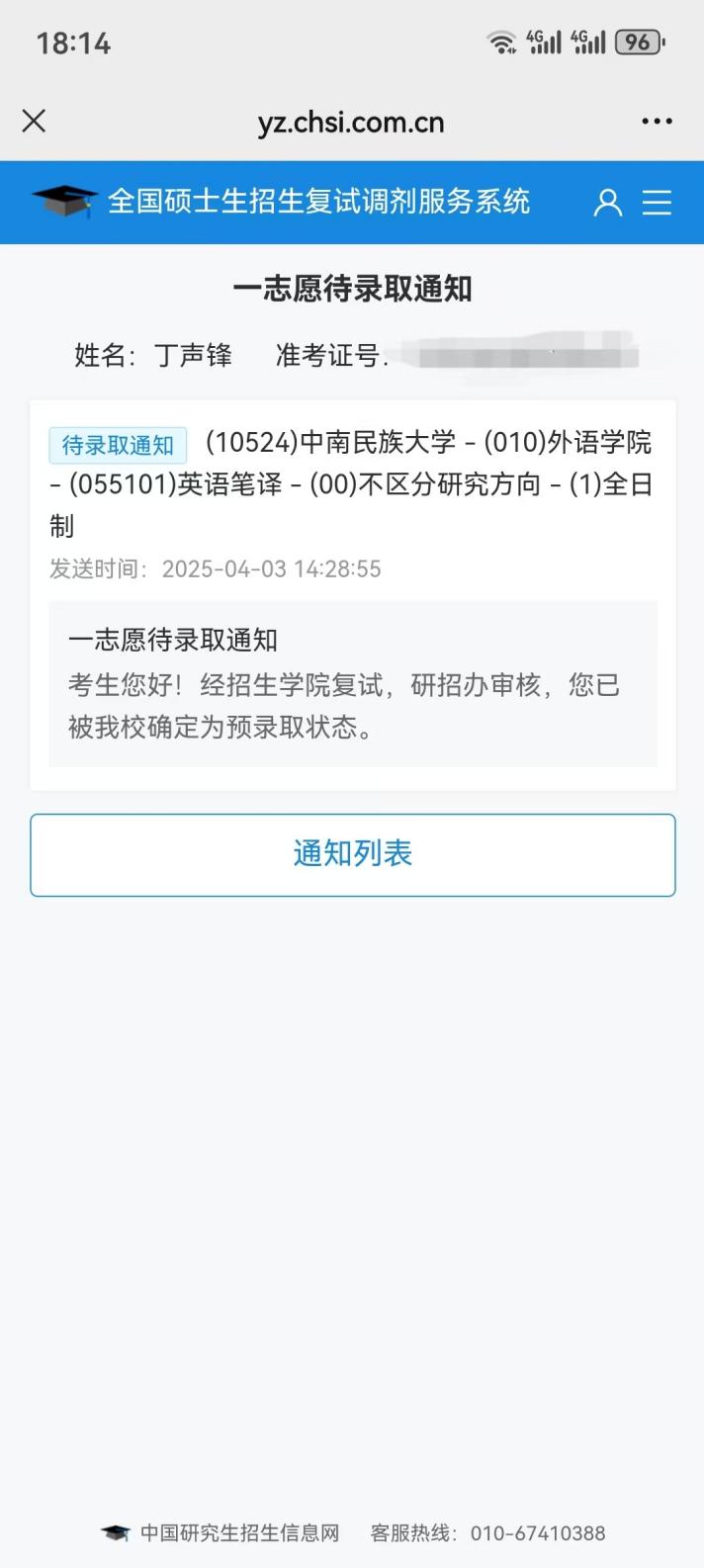 我是信誉最好的十大体育平台2021级商务英语本科3班的丁声锋,在25考研中初试成绩379,其中政治63,翻译硕士英语73,英语翻译基础131,汉语写作与百科知识112