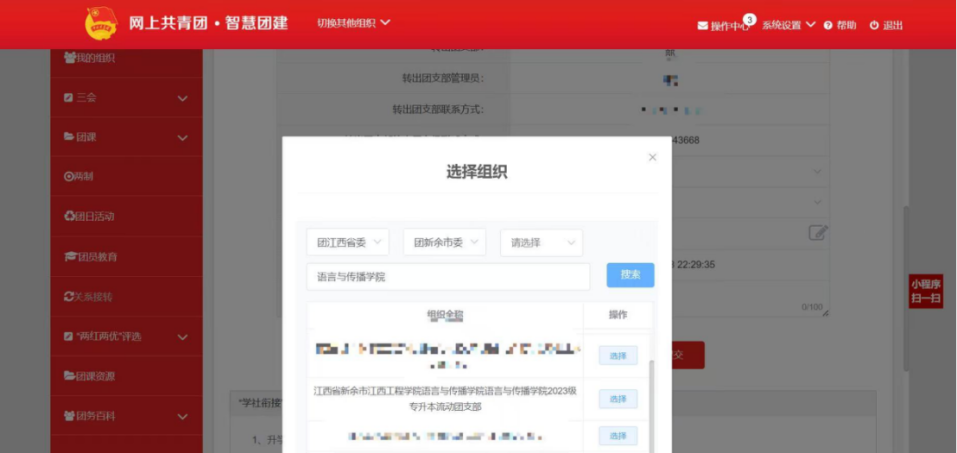 3.如图3所示根据要求填写自己的账号(即身份证)、密码以及验证码登入点击申请转入组织,搜索自己录取专业所属的“信誉最好的十大体育平台信誉最好的十大体育平台2023级专升本流动团支部”,选中并发起转接。