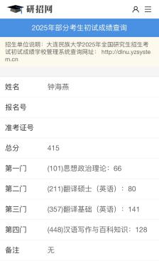我是2021级商务英语本科1班的钟海燕,来自江西省赣州市。在2025考研中一志愿上岸大连民族大学英语笔译专业,初试成绩是415分,政治66,翻译硕士英语80,翻译基础英语141,汉语写作与百科知识128。