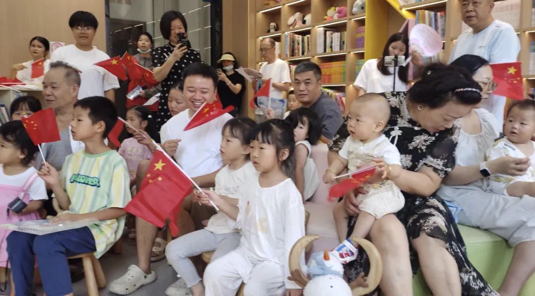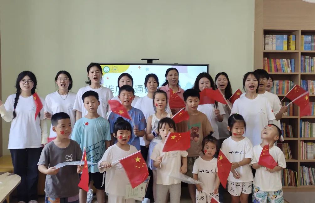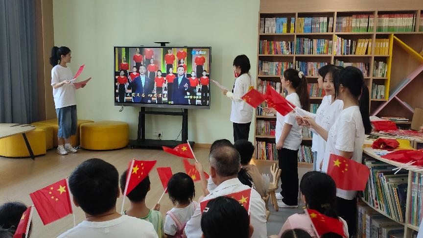 最后,随着气势磅礴的伴奏响起,实践队队员和小朋友们挥着小红旗大声合唱起《少年中国说》。“故今日之责任,不在他人,而全在我少年!”的朗诵声铿锵有力,饱满昂扬的情感瞬间鼓舞全场。合唱中,实践队队员和现场小朋友默契配合,将“少年智则国智,少年强则国强”的信念融入每一个清晰有力的音节,台下观众深受感染,掌声与欢呼声此起彼伏。