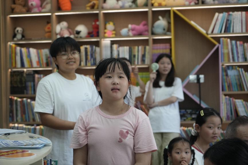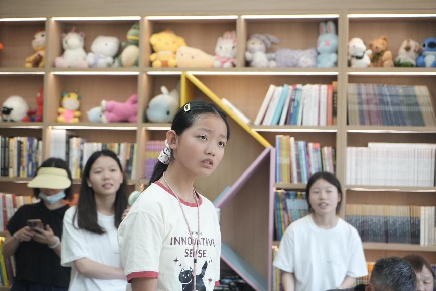 实践队队员余妍妍以经典现代诗歌《黄河颂》为媒,以标准普通话为桥,带领孩子们用铿锵诵读传承黄河精神,用书香浸润童年,让语言之美与文化之魂在抱石书房中回荡共鸣。