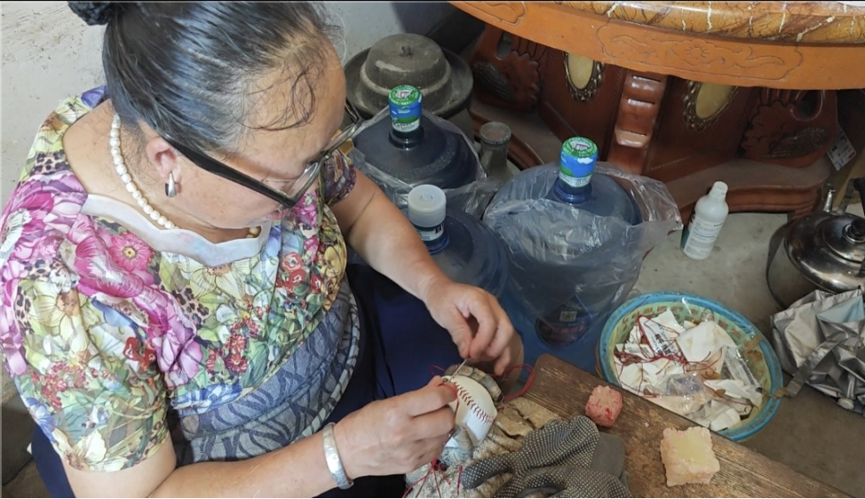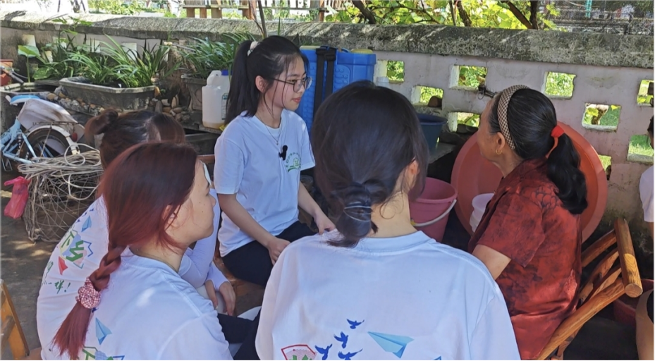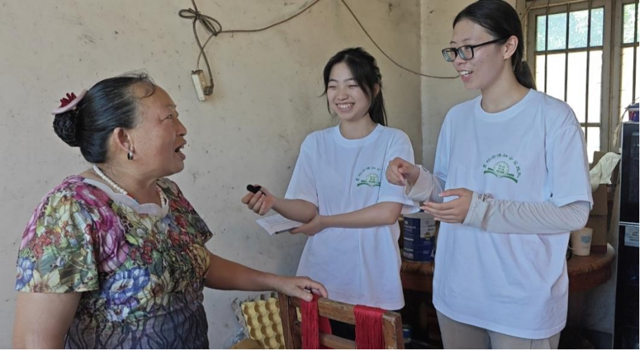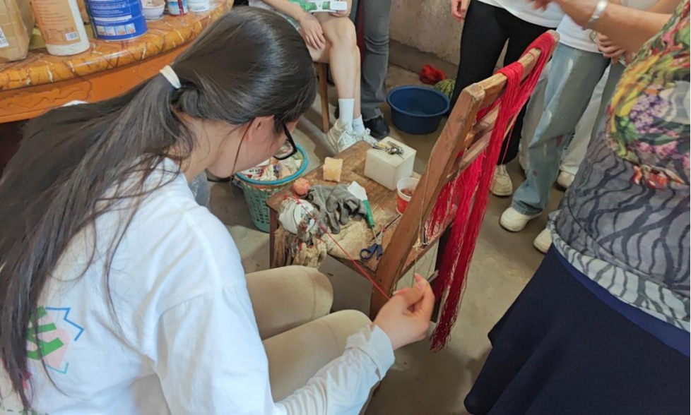 脚步前进,我们推开一扇小木门,来到一位彝族奶奶家中。她戴着老花镜,手中的银针上下翻飞,正专注地绣着一件精美的球形手工,细密的针脚里,藏着日常的点滴。奶奶放下手中的活计,热情地招呼我们坐下,布满皱纹的脸上洋溢着温暖的笑容。志愿者们却对奶奶手中的手工颇感兴趣,在奶奶的教导下,队员们学着奶奶的样子,一针一线地动起手来。