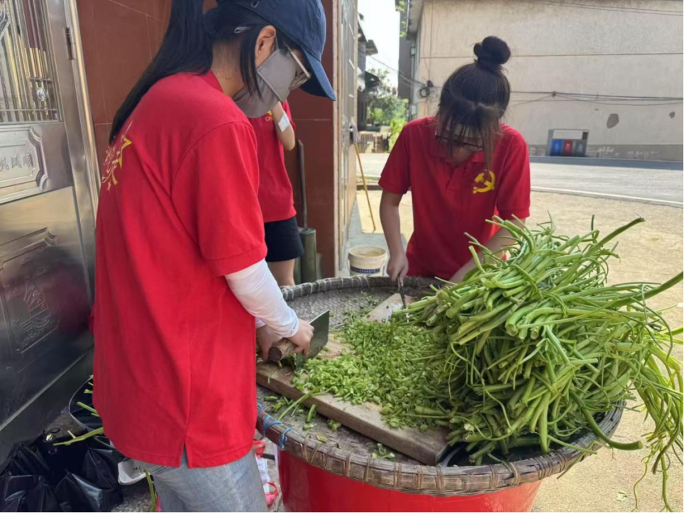 在哲村的农家小院,队员们接力开启“食材变身”之旅。刚从菜园采摘的鲜蔬,经择菜、洗菜的细致处理,此刻在竹匾上迎来“终章”。队员们并肩行动,菜刀起落间,青绿的菜段簌簌落下,带着泥土气息的食材,正被队员们雕琢成餐桌上的期待。这一方竹匾,承载的不只是切碎的菜,更是三下乡里,队员们触摸乡土烟火、携手劳作的温暖注脚,让青春在切菜的脆响中,和乡村生活紧紧相融。