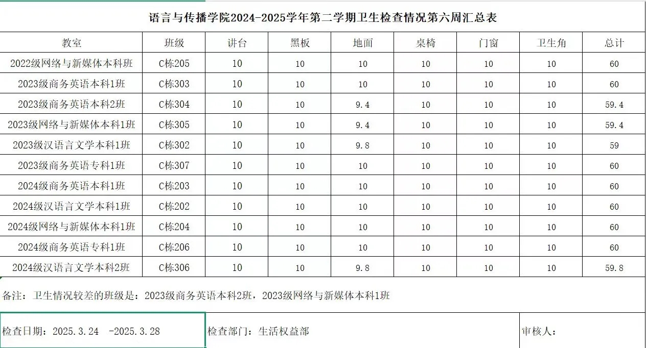 2.检查全校各班级卫生情况。对公司卫生定期进行检查,并及时通报改善卫生情况,使各班级保持教室整洁,营造一个良好的学习环境。