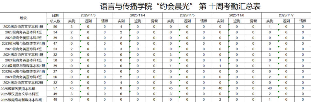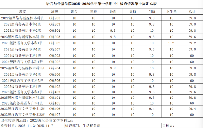 学风建设第1线|第10周卫生考勤情况通报汇总表